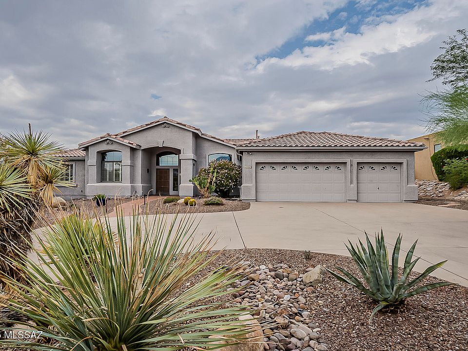 Located in the confines of OMNI Tucson National Country Club, this gorgeous four-bedroom, three-bedroom home in Nob Hill Estates sits on a 0.46-acre lot and has approximately 3,030 square feet of living space. With the ideal split bedroom floor plan, the master suite features his and hers walk-in closets, separate vanities, a jetted tub and a separate shower. The guest bedroom has an ensuite bathroom for privacy and comfort. The open kitchen is a chef's dream with custom mesquite cabinets, a large island/breakfast bar allowing for ample meal preparations and eating area. Abundant natural light flows throughout creating a bright and airy atmosphere. The heart of the home is the expansive great room that features a cathedral ceiling and a custom-designed fireplace for a warm and comfortable feel. Step outside the extended patio and enjoy mountain vista, golf course and glorious sunset views. With a 3-car garage, a circular driveway and beautiful landscaping, this property combines practicality with aesthetics.
