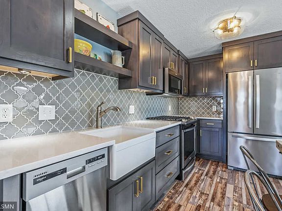 Beautifully updated 2 bed townhouse in the heart of Champlin. Minutes from everything you need this newly remodeled home will be tough to beat. Updates include new LVP and carpet throughout, custom cabinets in kitchen & bath, stone countertops, designer tile backsplash, all new lighting fixtures, under cabinet lighting, all new premium custom windows, custom banded roller blinds, knock down ceiling, fresh paint, newer appliances, new furnace and water heater.