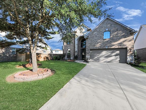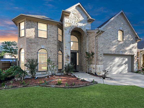 Beautiful Westin Homes situated on a cul-de-sac street within gated community. This house features an attractive brick & stone exterior, complemented by an impressive eight-foot entry door that opens to a striking rotunda foyer with a spiral staircase. The two-story family room features an impressive wall of windows and plantation shutters throughout. The kitchen is thoughtfully designed with large island, granite countertops, a breakfast area and wine rack. The luxurious primary suite is conveniently located on the first floor. The second floor offers 3 spacious guest bedrooms, a media room and a game room. A covered back patio extends the living space outdoors. Residents benefit from a range of community amenities, including a 24-hour manned gate for enhanced security, a pool, playground, and scenic lakes with walking trails. With convenient access to major highways and nearby shopping, this property exemplifies the ideal balance of luxury, practicality, and community living.