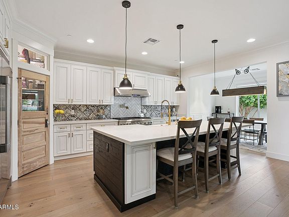 Welcome to your dream home in the heart of Scottsdale — a luxury newer construction residence that perfectly blends craftsmanship, comfort & contemporary design. This custom-built, energy-efficient home features five spacious bedrooms plus a bonus room, offering the ideal balance of functionality & style for modern living. From the moment you step inside, you'll be greeted by real hardwood floors & an open-concept floor plan. The gourmet kitchen is a true showstopper — a Thermador gas range with pot filler, built-in refrigerator, new wine fridge & large island illuminated by designer pendant lighting set the tone for effortless entertaining. The walk-in pantry, hidden behind a reclaimed-wood door and lit by a statement chandelier, adds both charm and practicality. (cont.) The great room is anchored by a fireplace with a reclaimed vintage mantle and custom cabinetry, offering the perfect setting for cozy nights in or gatherings with family and friends. Wide sliding glass doors open to a covered paver patio and landscaped backyard, seamlessly extending your living space outdoors - ideal for dining under the Arizona sky or relaxing in the shade.