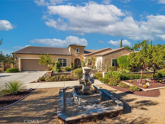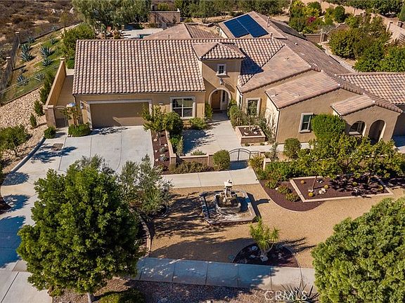 Stunning single story luxury pool home with breath taking views. This home is located in Riverside's exclusive Stellan Ridge neighborhood and sits on a sprawling 3.19 acre lot. As you approach the front entrance you will be greeted by mature trees, beautiful water wise landscape and a gorgeous water fountain. This resort-like home has (owned) solar panels. Featuring 4 bathrooms, 3 large bedrooms, an office, a flex room with partial kitchenette and sitting room. Huge laundry room with storage cabinets. The expansive master suite offers two separate walk-in closets. The kitchen opens to the family room and is a chef's dream with granite counters, soft close cabinets and drawers, large walk-in pantry, top notch Bertazzoni Italian stainless steal convection range, convection wall oven and built-in microwave. Floor to ceiling glass accordion doors that lead to the backyard oasis. The backyard features custom hardscape and landscape with drainage system, fabulous sunset views, a sparkling pool and spa with water features, a cozy fire-pit, outdoor shower, custom built gazebo entertainment bar with built-in BBQ and a T.V. Separate gated side yard is terraced with multiple citrus, peach, plum, mango, persimmon, guava, avocado, pistachio, almond and pomegranate trees. This space is perfect to use as a dog run.