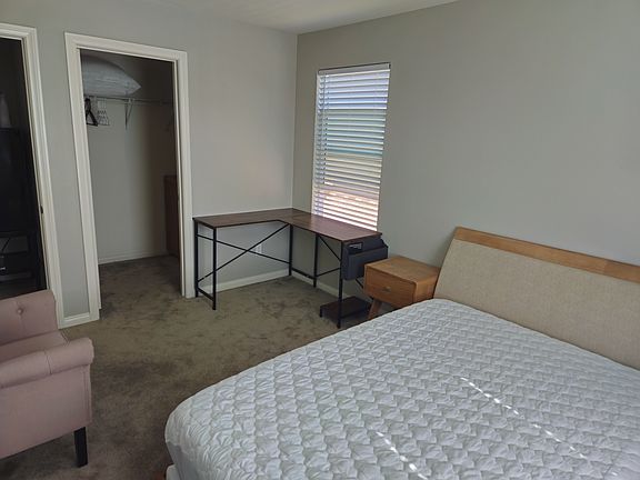 Furnished 2nd floor bedroom with walk-in closet, carpet, mini-fridge, and shared bathroom. Access to shared utilities/spaces (e.g. kitchen, laundry, 2nd floor den, & etc). Recently built (~2020) in safe gated community with community pool and gym. Close to Claremont Colleges.