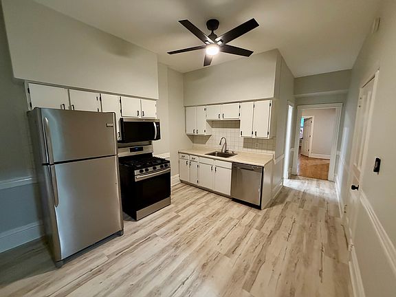 Unit features a large main bedroom with great natural light, plus two additional bedrooms. Hardwood floors and a functional layout. Kitchen offers newer stainless steel appliances, dishwasher, and pantry. Updated bath with modern finishes. Enclosed back porch with access to backyard. Laundry in building.
