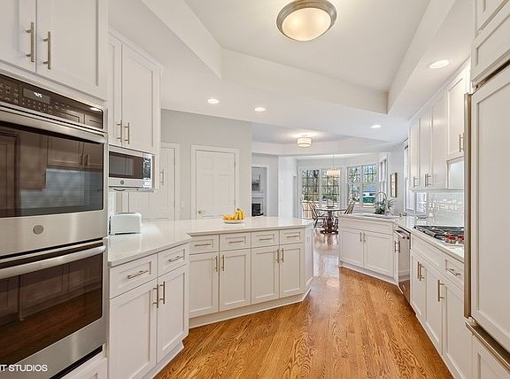 FINALLY priced to sell! Don't miss a great opportunity to own this amazing home with space galore 2 blocks from the beach. It features an open floor plan, brand new white kitchen, family room, attached garage, all set on a huge 107 by 150 lot. The sparkling eat-in kitchen and breakfast room with custom cabinets, quartz counters and high-end appliances was completed in 2019. The living room features a soaring vaulted ceiling, lots of natural light and a gas fireplace. The large family room includes a wet bar, gas fireplace and expansive wall of glass sliders, with a separate entrance and full bath, perfect for showering after a day at the beach. There's a bonus four-season sunroom and a dining room. A half-bath and laundry/mud room complete the first floor. The second floor master suite includes an updated marble bath and his and her walk in closets. Additionally, there are 5 bedrooms and 3 full baths. The expanded finished basement features recreation space, art room, gym area, a home office and storage galore. The outdoor oasis includes a bluestone patio and mature landscaping. If that's not enough, it's a very short walk to both downtown Winnetka and the Hubbard Woods retail district, train stations, the Green Bay Trail, parks and the Community House! Virtual or in person showings are available for all buyers.
