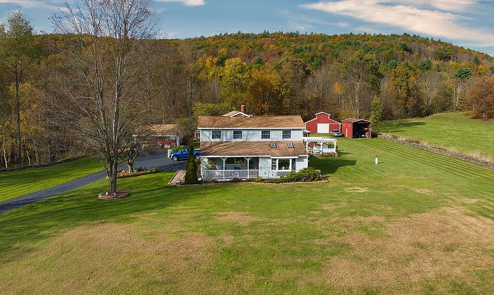 Upstate New York's Fall foliage is calling you to come take in the incredible views this property has to offer in beautiful Unadilla. At the end of a winding blacktop driveway, this 73 acre property and country home sits atop the hillside overlooking breathtaking views of the landscape and offers seemingly endless back trails throughout its hearty timber, offering exceptional hunting and exploring. Four bedrooms, three bathrooms, an open layout eat-in kitchen, and front room to host get togethers are only a few of the interior features this home has in store for you. Upstairs, a spacious primary bedroom suite and three additional bedrooms give way to a living area, office space, and full bath. Efficient heating and cooling throughout with mini splits and electric baseboard to keep you comfortable, as well as a wood stove. Outside, you'll take in views of the rolling hills from your oversized deck and gazebo area to relax amongst the scenery while also being just a few minutes from Sidney and a short drive to Oneonta and Cooperstown. An attached two car garage, separate detached two car garage, large outbuilding, and well maintained barn can more than accommodate any tools or equipment for your hobbies. Call today for your private showing.