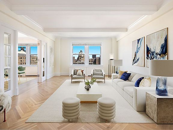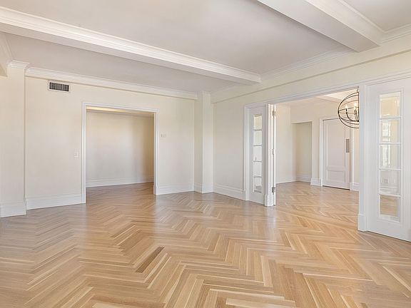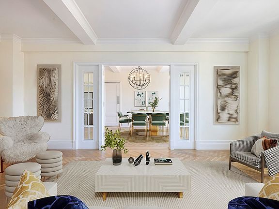 The side-by-side beautifully proportioned formal living and dining rooms are truly elegant and are separated by French doors framed by beveled glass panels, thereby creating an expansive living and entertaining space. These rooms face east and the 4 oversized windows provide brilliant natural light and unobstructed quintessential open city views. Both rooms have stunning solid white oak wood floors (just refinished) in a herringbone pattern, high beamed ceilings (9 ft.), and striking crown (6 inch) and baseboard (9 inch) moldings.
