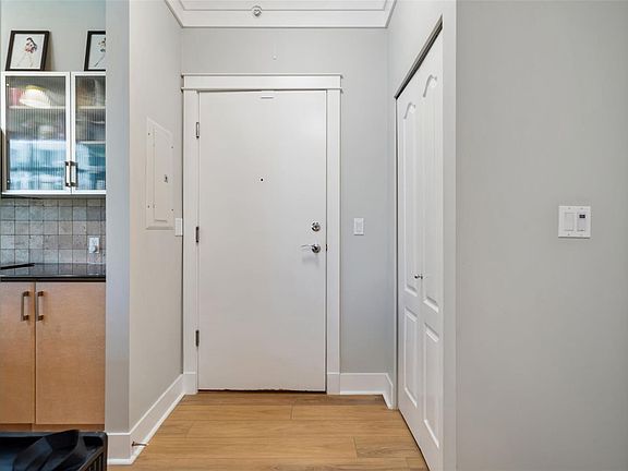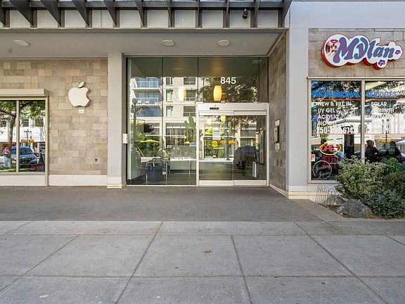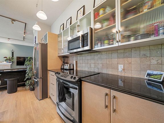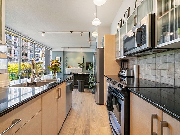 Expansive south-facing windowsRich hardwood flooringSleek black granite countersStainless steel appliancesOver-height ceilingsGenerous storageIn suite laundry