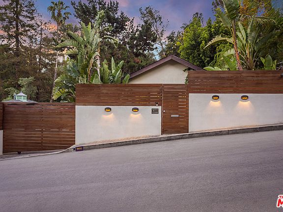 Exquisite gated property surrounded by lush landscaping nestled on a triple lot. Featuring wide plank floors, impressive vaulted and open-beam ceilings with skylight accents, this bright and beautifully updated home is a private canyon retreat while remaining only minutes away from Wonderland School and the iconic Sunset Strip. The gourmet chef's kitchen is fully equipped with gorgeous cabinetry and stainless steel appliances and leads to an open living and dining area. The charming owner's suite is complete with ensuite bathroom and his/hers walk-in closets and features two spacious patios that overlook the expansive yard and mature tropical vegetation, perfect for both entertaining and relaxation. The stone staircase leads to the lower level with custom built-ins and three guest bedrooms, two of which open to the grassy yard through beautiful French doors. Parking includes carport with long private driveway.