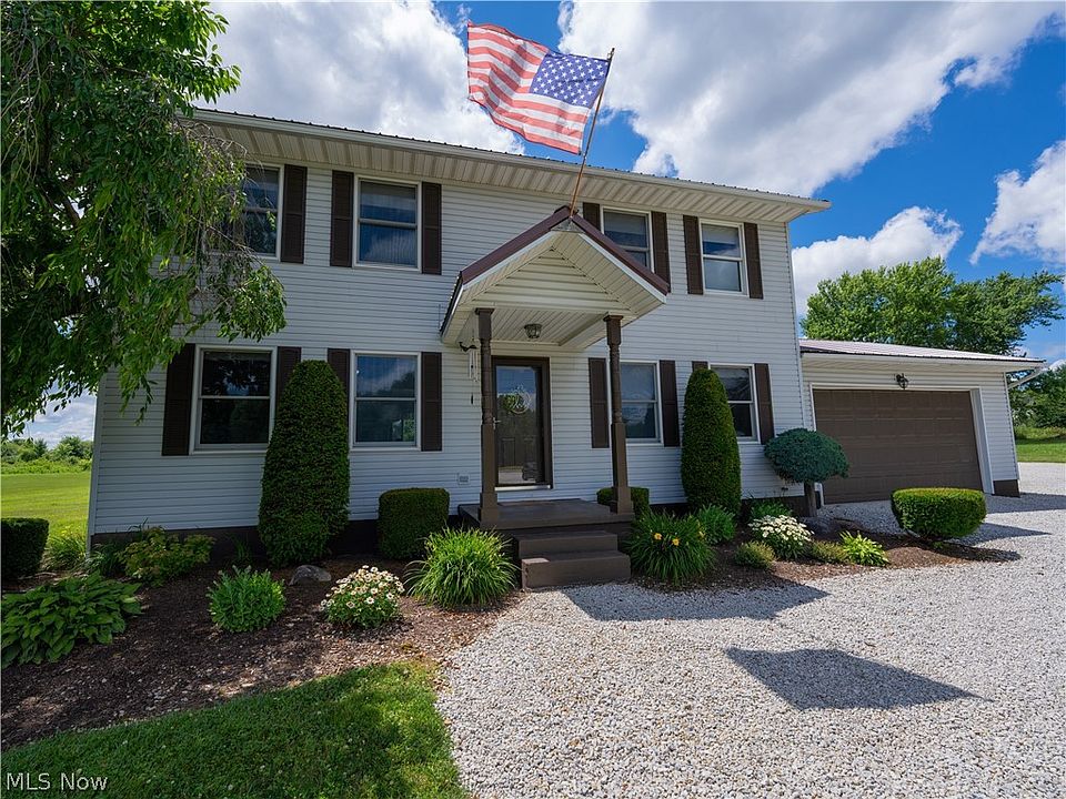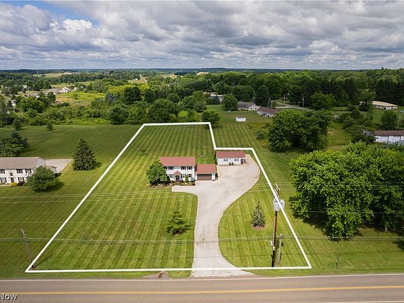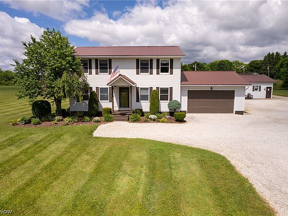 This beautiful country colonial features 3 bedrooms and 2 1/2 baths. It features a well-designed kitchen with updated appliances. There is a formal living room, a family room and a formal dining rooom with glass sliding doors to a 12 x 14 deck that overlooks an amazing 1.64 acre lot. The primary suite is located on the second floor and features a walk-in closet and an insuite bathroom, there are also two other nicely sized bedrooms and another full bathroom. This home has a full basement with a laundry area. There's an oversized heated 2 car attached and an additional detached 24x32 garage with a 75,000 BTU furnace, fully inulated wall, 220 electric service, a garage door opener and wired internet connection. The home attached garage and detached garage had metal roofs installed in 2020. The mini edtate is conveniently located just 3.5 miles from the Ohio turnpike exit with easy access to both Cleveland and Warren/Youngstown.