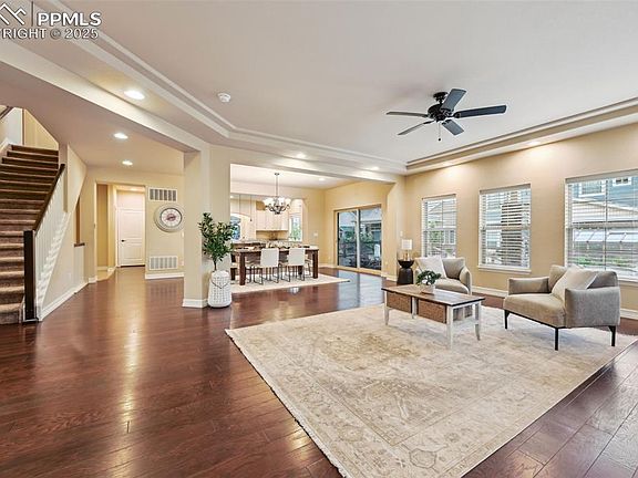 Incredible Banning Lewis home that impresses from the moment you walk up to the home with a gorgeous covered front porch and top floor balcony. Entering the home a vast open floor plan beckons you in as the living dining and kitchen area flow seamlessly together. The living area has a beautiful stone accented fire place thats perfect for the Colorado winter evenings. The dining area walks out to the covered back patio with fenced in back yard. The kitchen itself is a dream with large barstool height center island, stainless steel appliances including a side by side refrigerator and freezer, ample counter and cabinet space, and large pantry. The main floor also has a spacious office space, perfect for the at home worker. Upstairs a wonderful loft space offers many possibilities like a second living space, kids play room, or workout area. The upper level has four bedrooms including the master bedroom. The master suite provides walk out access to the front balcony has a spacious walk in closet and wonderful ensuite bath with double vanity, large garden tub, and free standing shower. Bedrooms two and three share a jack and jill full bath. Bedroom four, another full bath, and the laundry space finish out the upper level. The basement is just as impressive with ample natural light as you walk down to the enormous family room. Just off the family room is bedroom five and full bath. This fabulous home is walking distance to school, hiking/biking trails, pools/parks. Community includes pickle ball courts, dog park neighborhood schools, over 65 acres of parks/trails/open space, tennis courts, basketball court, rock climbing parks, zip-lines, access to pools, splash pad, water park, and dog park. Recreation center houses a fitness center and also regularly hosts classes and events for all ages. In the summer months, catch a neighborhood concert, festival, food trucks, farmers market or enjoy other regular community events. This community and home have it all.