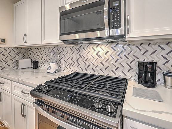 Luxury, coveted ground-floor 3-bedroom, 1 ¾-bath condo in a prime gated community near Summerlin, Boca Park, and Tivoli Village. Mostly owner-occupied, peaceful, and near top shopping and dining. This fully renovated unit features a 6-figure remodel, an attached 2-car garage with direct entry, and breathtaking pool & fountain views. The open-concept kitchen boasts quartz countertops, new white shaker cabinets, a professional chef’s faucet, stunning backsplash, and NEW stainless steel appliances. High-end maple engineered hardwood floors, smart-home lighting, plantation shutters, a cozy fireplace, and an outdoor patio add to the luxury. Both bathrooms are fully upgraded with Carrara marble, Grohe faucets, shaker vanities, and a primary has a walk-in shower. All three bedroom closets feature custom organizers. In-unit laundry and ample garage cabinetry complete this exceptional home. Best unit in the neighborhood -- a must see!