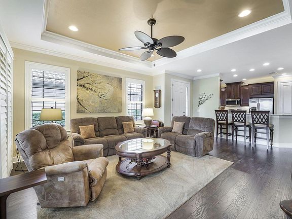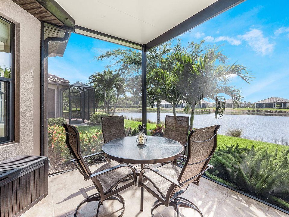 This impressive and pristine, fully furnished, two bedroom, two bathroom plus den and two car garage free standing Villa Home built in 2018 exudes elegance and offers a range of modern upgrades and conveniences. The floor plan provides a sense of spaciousness and luxury with 8' doors, beautiful luxury vinyl flooring, tray ceilings in the Great Room, Dining Room, Primary Bedroom and Den/Study. The wide crown molding, plantation shutters and recessed lighting add sophistication to the interior. The elegant kitchen boasts upgraded cabinetry, stunning quartz counter tops, a counter-height breakfast bar, gas range, tumbled marble back-splash, base cabinets with pull-outs and under-cabinet lighting. The dining room and den/study feature wonderful custom built-in office cabinetry to maximize workspace functionality, while stacked stone decorative walls in the Dining Room and Office add character and visual interest. The Primary Bedroom with en suite bath reveals a bay window with gorgeous lake views, a custom designed closet system, double vanity, water closet and a large walk-in shower. Space saving solutions in the guest bedroom include a built-in Murphy Bed with XL twin beds, custom cabinetry and closet systems. Additional custom cabinetry and laundry sink complete the the laundry room. Lovely chiseled-edge travertine flooring and hurricane rated electric screens in the extended screened and covered lanai expand the living space of the home. Convenient garage attic pull-down stairs provide easy access to additional storage. The central air conditioning system was replaced in 2020 and the exterior of the home was freshly painted in 2023. Esplanade at Hacienda Lakes is a recently completed, lushly landscaped, low-density gated community with a modern clubhouse, a tropical heated community pool and hot tub, fitness room, tennis courts, pickleball courts and playground conveniently located with easy access to the interstate, beaches, shopping and dining in Naples and Marco Island.