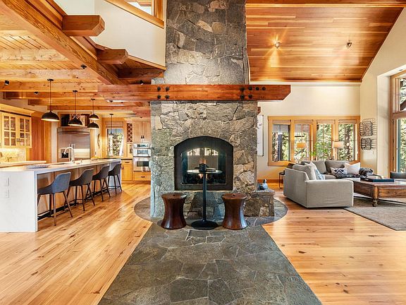 From the moment you arrive, this Lahontan home draws you in with a quiet sense of peace. Tucked gracefully at the end of a long, tree-lined driveway, it feels worlds away—set back from the street and embraced by nature. The approach alone invites a deep breath and a slower pace, with three welcoming decks and a gentle waterfall feature that creates a serene prelude to the warmth within. Step through the doors, and you’re immediately surrounded by comfort. A custom four-sided stone fireplace stands proudly at the center of the home, casting a golden glow through the living, dining, and kitchen spaces. Every detail—handcrafted wood beams, soft natural light, and rustic textures—embodies the charm of authentic mountain living. Outside, the magic continues. A rare, landscaped backyard with lush green grass, a fire pit, twinkling lights, and a private hot tub offers the perfect setting for both lively gatherings and peaceful reflection. With direct access from the kitchen and primary suite, the outdoor spaces feel like a natural extension of the home—ideal for year-round enjoyment. The primary bedroom is a retreat of its own, with French doors leading to the patio, a soaking tub, and double vanities that bring a sense of calm and luxury. The updated kitchen, framed by beautiful granite countertops, blends mountain character with refined design, perfect for holiday gatherings and evenings shared with friends. Warm, inviting, and timeless in its design, this Lahontan home embodies the essence of true mountain living—a place that welcomes you home and stays with you long after you leave.