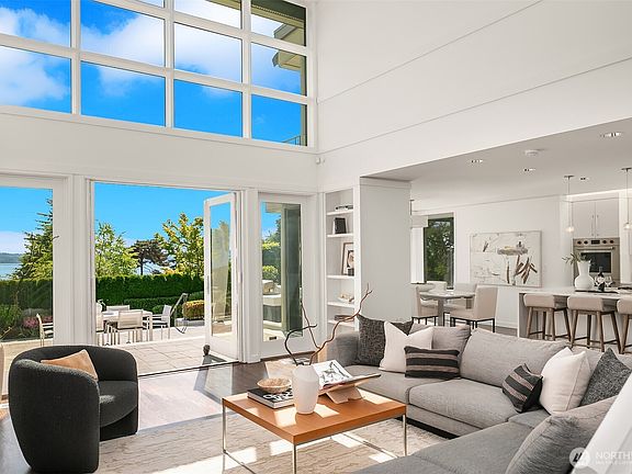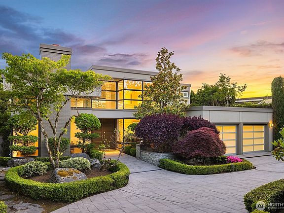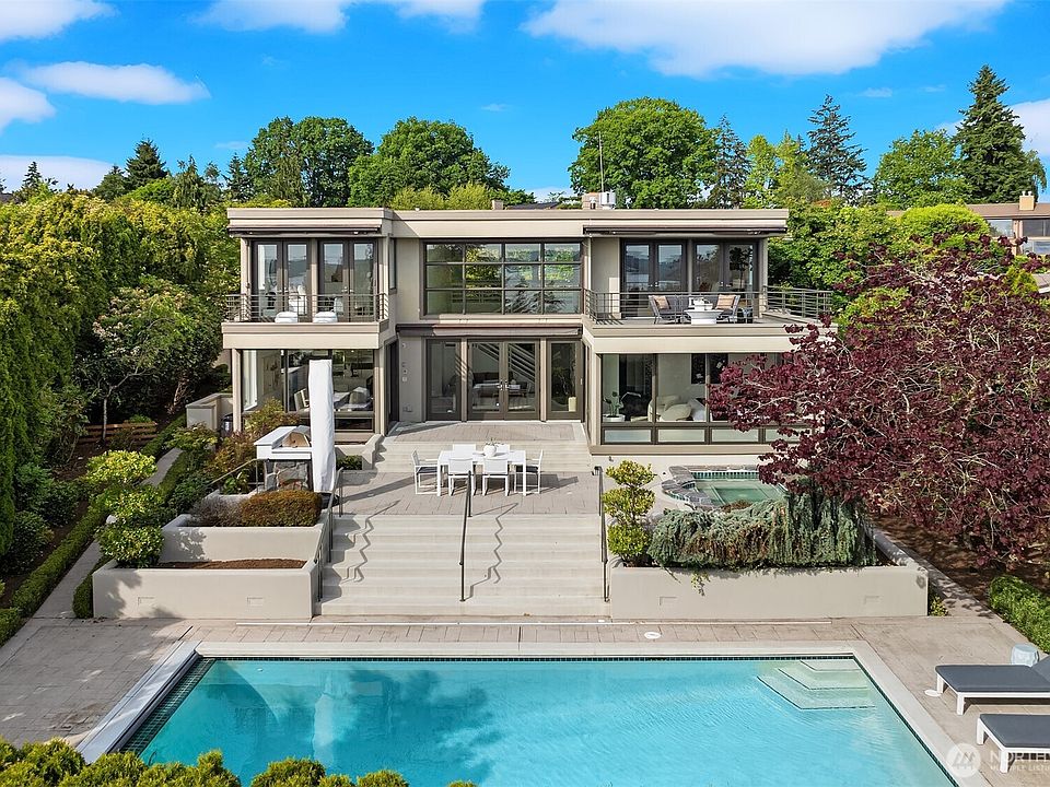 Set in coveted Medina Heights and enveloped in verdant landscaping, this Bender-Chaffey custom residence offers sweeping Westerly views of Lake Washington, Seattle Skyline and Olympic Mountains from both levels. Designed for grand entertaining and everyday elegance, the home features an impressive remodel, soaring ceilings and floor-to-ceiling glass walls that capture the stunning vistas and overlooks the resort-style pool and spa from nearly every room. The well-appointed kitchen boasts a suite of professional-grade appliances perfect for the avid entertainer and epicurean chef. Rare-to-find main floor primary plus grand jr suite on upper floor. Blending style & sophistication, this one-of-a-kind residence is designed to inspire & impress.