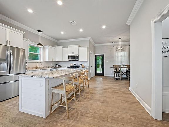 Inside, you’ll find numerous upgrades including white painted cabinets with gold hardware, upgraded light fixtures, stainless steel appliances with a gas stove and a Bosch dishwasher, tankless water heater, a shiplap kitchen island, wood-look tile flooring, and custom cased windows in the main living area. One of the upstairs bedrooms features a charming board and batten accent wall, adding a custom touch.