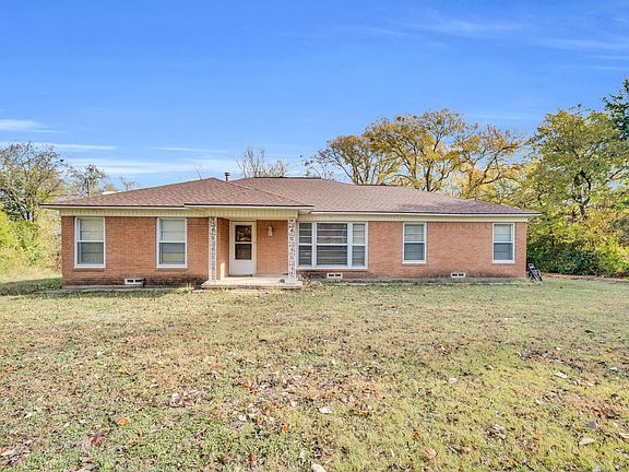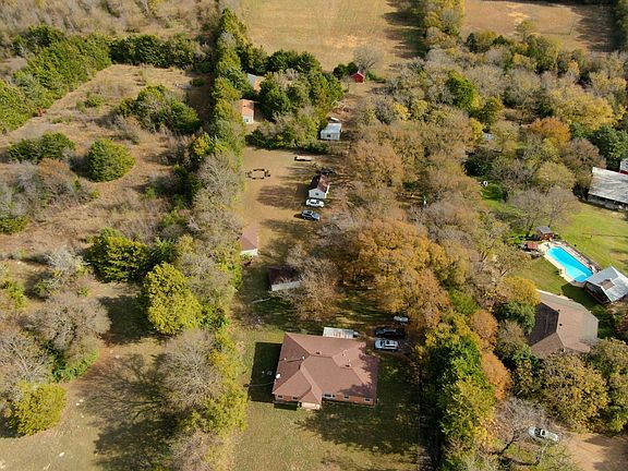 9.3 acre property. The feeling of country within the city limits. No restrictions as owners had a horse previously. Backs up to Ten Mile Creek, where the flood plain exists, only at the rear of the property. One newly renovated bathroom. Split bedrooms. Two on one side share the new bathroom. Another bathroom off the living room. Outbuildings include one small barn, and a larger one used as storage for tractor. It is 20X30. Five additional, four with electricity. First, was to be used as a guest house, but not completed. Workshop with electricity. 2 offices, one with a window unit, and the other with an AC-Heat split. Conveniently located near I-35E. A well is on the property at the rear, but not used by the sellers. Much of the property is is fenced with chain link, barbed wire, and a cross fence.