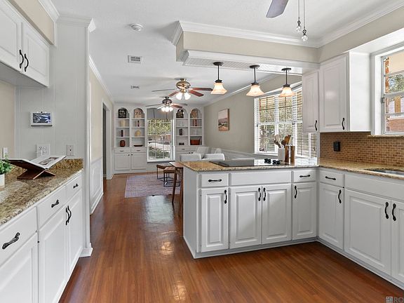 Beautifully updated 4BR, 2.5 Bath home with a backyard oasis and countless upgrades! Enjoy your own retreat featuring a custom gunite pool with hot tub, tanning ledge, and waterfall—plus outdoor TV and speakers that remain. The welcoming front porch offers two swings and lovely columns with lighting, perfect for relaxing afternoons. Inside, you’ll find a spacious kitchen with granite countertops, double ovens, and abundant cabinetry. The keeping room and formal dining area both feature built-ins, while the den offers wood floors, a fireplace, and French doors leading to the patio and pool. Recent updates include stained privacy fence with pet portholes, new HVAC, full-house generator, new water heater, home security system, multiple Ring cameras, automated backyard lighting, and upgraded electrical panel. Additional features include slate foyer flooring, crown molding, laundry with cabinets, and a rear 2-car garage with storage. Prime location—walk to St. Thomas More Church and School, and just minutes to The Legacy Club for pool, tennis, golf, fitness, and dining. Did not flood. Flood insurance not required (Zone X).