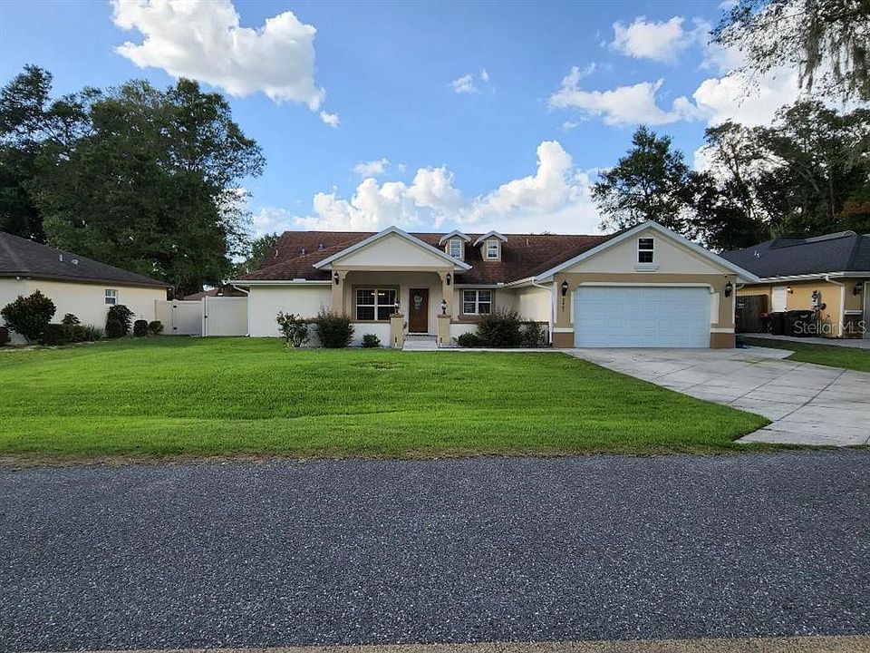 YOU MUST SEE THIS MOVE-IN READY HOME - Absolutely GORGEOUS 3 bed 2 bath home with 2-car garage in the NO HOA Orange Blossom Hills neighborhood, loaded with upgrades and a backyard paradise, complete with an oversized covered entertaining space and brand new CUSTOM fire pit! Enter your new home through the private courtyard and you can't miss the beautiful TRAVERTINE flooring, vaulted ceilings, split floor plan, and CHEF'S KITCHEN with a huge island with overhead pot rack, tons of lighting, granite counters, skylights, 42" wood cabinets, stainless steel appliances and a HIDDEN panty! Just off the kitchen is the mud room, and a separate large laundry room with a wash tub. On the same side of the home you'll find 2 roomy guest bedrooms both with vaulted ceilings and the guest bathroom. The living room is OVERSIZED with plenty of room for your office/work space or keep things fun with a game room space, maybe a pool table?! When you're ready to be wowed cross over to the LARGE master en-suite, boasting plenty of natural light, his and her walk in closets, and an absolutely DREAMY bathroom! The room has two granite top vanities opposed to each other and a private well-lit water closet. But you'll fall in LOVE with the huge jetted soaker bathtub, and GIANT walk-in glassed shower with TWO shower heads! The backyard has a new vinyl privacy fence wrapped around the new custom fire pit, covered lanai and huge 60ft shade covered entertaining space perfect for family & friend gatherings around the BBQ grill! Just built in 2016, this home has been well cared for and is MOVE-IN READY. Located just a couple doors down from the end of the street, this home is very private, and close to the VILLAGES with all the dining, shopping and entertainment options that come along with the Villages Square. Just a few minutes from I-75 makes commuting or traveling a breeze. Call today for your private tour!!