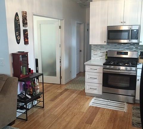Beautiful remodeled 3 bedroom upstairs apartment behind front house. Apartment has shared backyard and free use of washer/dryer laundry facility. New kitchen with quartz countertops and new appliances including stainless steel stove, dishwasher, fridge and over the range microwave. 1 car parking off alley. Looking for a long term tenant. Rent: $2600 Deposit: $2600 OAC Owner pays water only. Tenant responsible for all other utilities including, electric, gas, trash, cable/internet.