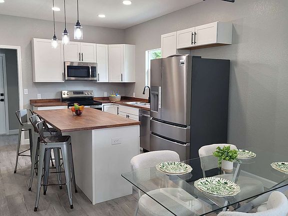 Corner lotModern kitchenVinyl plank waterproof flooringButcher block countertopsFull suite of appliances