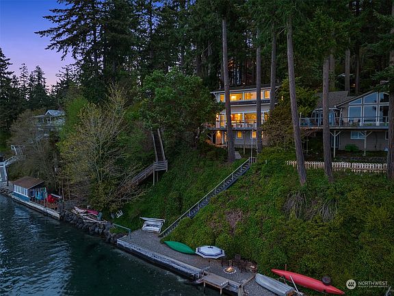 Welcome home to this charming west-facing waterfront cottage with magical Puget Sound and Olympic Mountain views. A true retreat for any season where you can enjoy the colorful sunsets and the sights and sounds of marine life from your spacious deck or bulk-headed beach. Adorable around every corner, this cozy cottage lives larger than it looks with living spaces on the main level, the primary bedroom encompassing the entire upper level with an office space boasting amazing views and two bedrooms on the lower level. Sturdy stairs to the beach, outbuilding storage and easy, native landscaping. Fantastic, thoughtful updates throughout the years, this meticulously maintained property is move-in ready for summer fun.