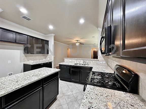 Fenced yardGleaming granite countertopsCovered patioIsland kitchenBlack appliance packageDual sinksSprinkler system