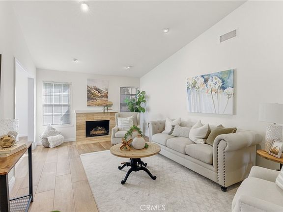 The living room offers warmth and character with its custom stone fireplace and elegant mantle. The spacious primary suite opens through a sliding door to a private covered patio, providing a peaceful retreat. Both bathrooms have been stylishly remodeled with designer tile and accents, upgraded vanities, hardware, and lighting. Additional highlights include a separate laundry room, a gated front courtyard with a spacious grassy area, A/C, newer windows, solar and a custom high-end patio cover complete with an electric shade and lighting—perfect for entertaining or relaxing year-round.