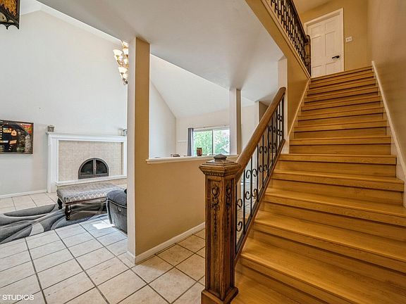 Unique 2 story home with 4 bedrooms, 4 baths and a finished basement. Main floor has a very large great room, dining room, kitchen and a bedroom with a pass through to the first floor 3/4 bath. The great room is highlighted with a vaulted ceiling, fireplace, and sliding doors to tiered deck. The second floor offers a spacious primary suite with attached full bath. On the other side of catwalk is the second, upper level bedroom suite with a full bath and walk-in closet. The basement is also finished with a large family room w/ a walkout to the back yard, a 4th bedroom, bath and laundry. This home sits on a large, quiet lot with mature trees and is located just off Rt. 30 and Burr providing an easy commute to the city and close to shopping & restaurants.