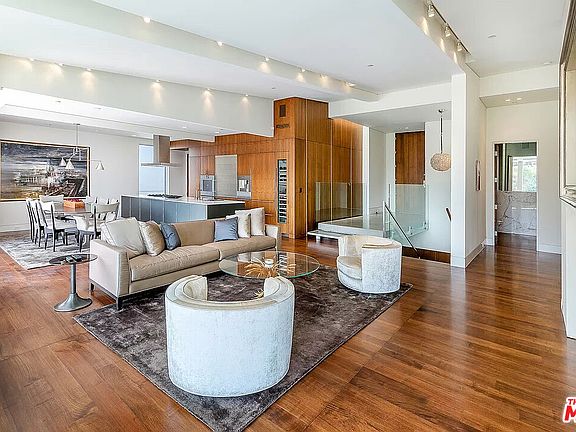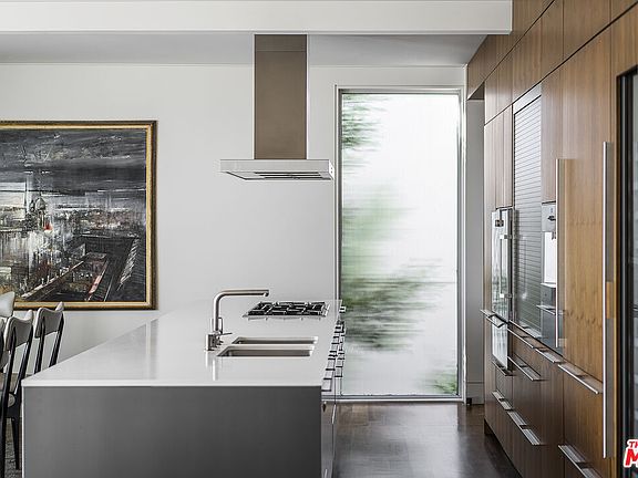 Mid-century modern masterpiece completely restored to the highest quality on the legendary Sunset Strip on one of the most private streets. Beyond a chandelier-illuminated entry, one is greeted with explosive city views in sun-filled living spaces that are built with captivating open concept and rare, custom stones and woods, where timeless, elegant aesthetics meets the most cutting-edge amenities. Voluminous living room with a sensational marble fireplace seamlessly merges with an exquisite Bulthaup kitchen with Subzero and Gaggenau appliances and a dining area. Lustron shades and drapes open onto luxurious outdoor entertaining spaces encompassing multiple wraparound decks with breathtaking views, and a private, hedged backyard boasting an oversized cabana with heaters, and a 45-foot heated pool and spa. Lower level tailored made for recreation and gathering features a trendy Lounge bar, and a movie theater overlooking the pool. Lavish primary suite provides a serene escape with a steam shower, soaking tub, and an expansive balcony. A 4-bed, 7-bath smart home automated by Crestron. This estate fulfills all your desires for domestic comfort.