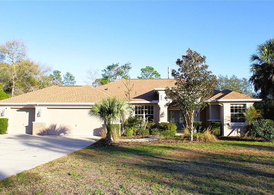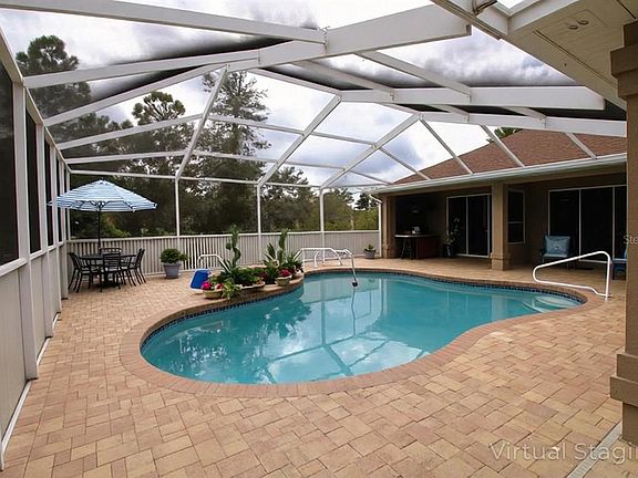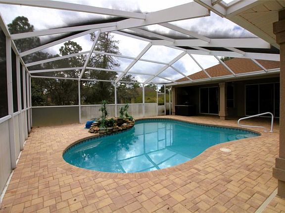 One or more photo(s) has been virtually staged. Set on a fully usable, fenced 1-acre lot in Hernando County with no HOA, this 4-bedroom, 2-bath residence offers approximately 2,500 square feet of well-designed living space and exceptional indoor-outdoor flow. Built in 2006 with architectural upgrades not often found in this market. The home welcomes you through double entry doors with etched glass into formal living and dining spaces featuring tray ceilings and rounded wall corners, adding subtle architectural detail. A dry bar in the formal dining area provides additional serving and entertaining space. The open kitchen and family room overlook the lanai and saltwater pool, with multiple sliding glass doors opening directly to the outdoor living area. Nearly every room surrounding the pool — including the primary bedroom, formal living room, family room, kitchen nook, and one secondary bedroom — offers direct lanai access, creating seamless indoor-outdoor living. The screened lanai and pavered pool area are designed for both relaxation and entertaining, complete with a built-in outdoor grill and ceramic egg-style grill. The saltwater pool serves as the focal point of the home and extends the living space year-round. The primary suite is privately located and features lanai access, two walk-in closets, and a bathroom with dual separate vanities, walk-in shower, and enclosed toilet room. Three additional bedrooms are located on the opposite side of the home. Additional features include ceramic tile flooring throughout main living areas, a gas fireplace, whole-house central vacuum system with multiple access points, an indoor laundry room with utility sink, and an attached front-entry three-car garage with space for storage or a workbench. Shingle roof replaced in 2022. Septic system. Property is vacant and ready for occupancy.