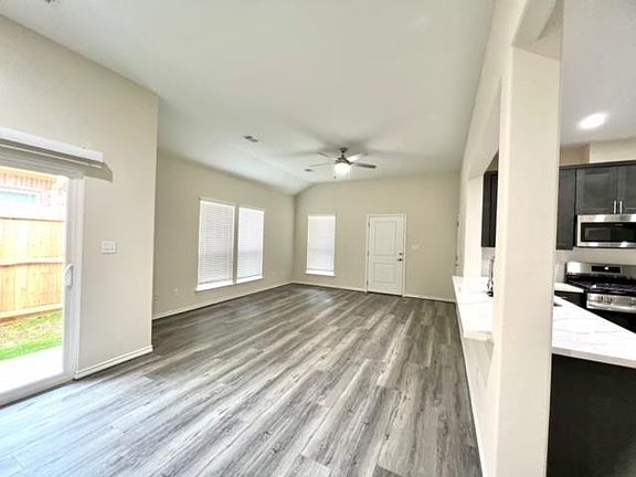 Two patiosHigh ceilingsQuartz countersLaminate wood style flooringShaker cabinetsOne car garageSpacious kitchen