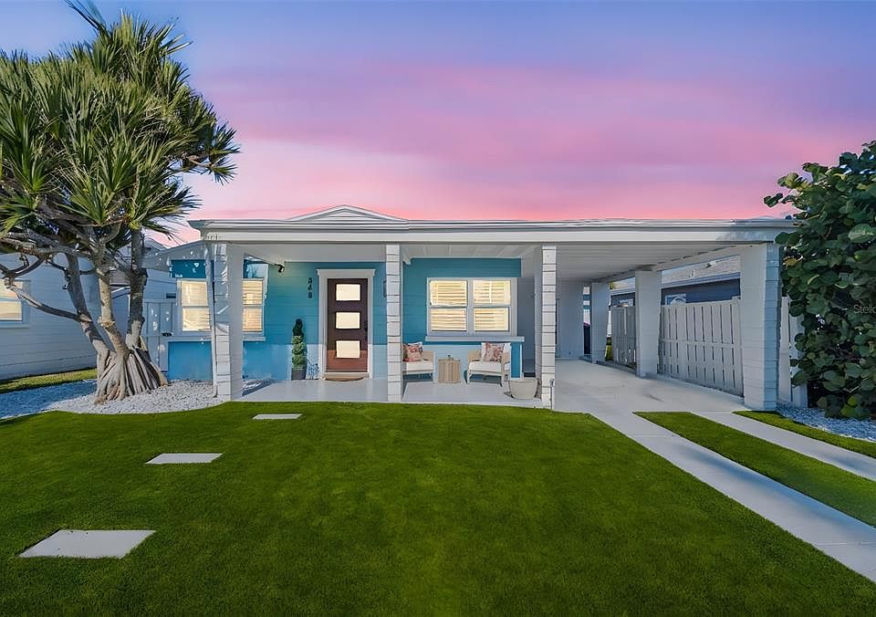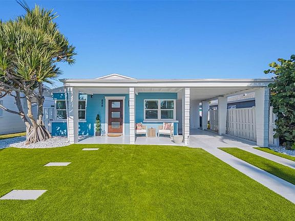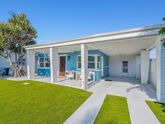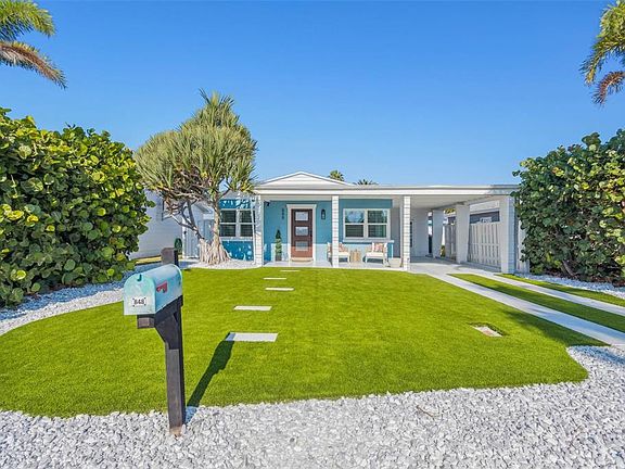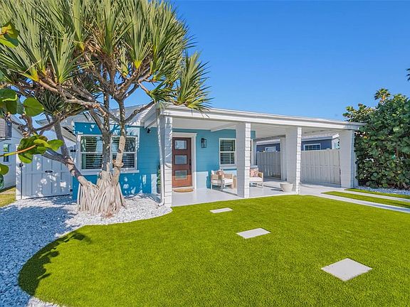 Welcome to your true Florida dream pool home, just four blocks from the Gulf of Mexico and located in the exclusive Surfside subdivision. This coastal retreat is an impeccably renovated home where every detail has been elevated with professional craftsmanship and interior-designer quality finishes. Nearly the entire home has been redone by Sierra Construction, creating a modern, elegant, and exceptionally low-maintenance living experience. Inside, enjoy wood-look tile floors throughout, remote-controlled ceiling fans, custom plantation shutters, recessed lighting, and five-panel solid wood doors with designer crystal hardware. The remodeled kitchen showcases quartz countertops, a farmhouse apron-front sink with a garbage disposal, soft-close drawers, under-cabinet lighting, and new stainless steel appliances (including a refrigerator with an ice maker and a custom dishwasher). Thoughtful touches include custom handmade barn doors, custom Container Store closets, a tankless hot water heater, and a 2022 roof equipped with hurricane straps. Step outside to your private oasis featuring a 2024 saltwater pool installed by Island Way Pools and a completely maintenance-free yard with premium turf from Everblade Turf Company. Additional highlights include hurricane-impact windows, a high-end front entry door, French doors with inset blinds, a vinyl shadowbox fence, 2 car carport with enough parking for three cars, and extra storage. The private hot-and-cold outdoor shower is perfect after a day at the beach. This solid block home is energy-efficient with added attic insulation. Nestled on Little Punkin Key, the community is surrounded by the intracoastal waterway, and the sandy shoreline is only blocks away. Along with nearby public access, residents enjoy an exclusive private Surfside Beach Club with private beach access, parking for members, a shower, and benches for just $40 annually. This immaculate, professionally designed, fully updated 2-bedroom coastal gem is offered with custom furniture if desired. Live the Florida seaside lifestyle—your dream home awaits.