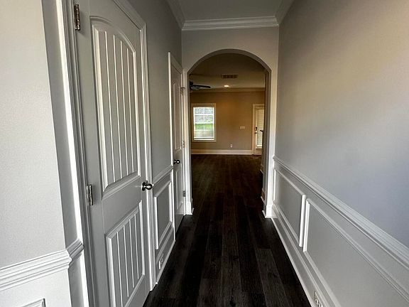 Great room with corner fireplace, Heavy crown molding, trim work, and arches throughout. Kitchen features granite counters, tile backsplash, stainless appliances, and a walk in pantry.