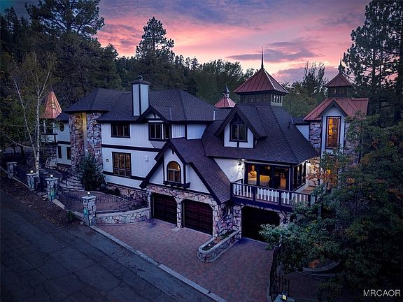 Tucked away in Big Bear’s coveted Village area, this unexpected Tudor-style estate is like no other — a private compound offering unmatched craftsmanship, serenity, and grandeur on nearly two acres of park-like grounds. Behind its gates lies your own private forest of towering pines and manicured pathways leading to charming gazebos, arched bridges, barbecue pavilions, and a turf sports court framed by the two-bedroom guest house. The main residence spans over 10,000 square feet across three levels, designed for both entertaining and peaceful retreat. On the lower level, an indoor rock grotto spa with its own bar sets a resort-like tone, complemented by a gym, sauna, and wine cellar. The main floor invites gatherings with a game room and full bar opening to a wraparound balcony and extensive outdoor patio. There is a spacious family room with a double-sided stone fireplace, a formal dining room, and a grand kitchen built for culinary inspiration. Also on this level are a private mother-in-law suite, an additional guest suite, 2 guest bathrooms, laundry room and walk in butlers pantry. The focal point of the entry, a sweeping circular staircase, leads to the upper level where the primary suite and retreat anchor the floor, along with two additional bedrooms and a stunning family room crowned by vaulted wood-beam ceilings. You will also find a richly detailed den with handcrafted beamwork surrounding the fireplace — currently used as a bedroom, though perfectly suited for a library or private study. The guest house, equally inviting, offers two bedrooms and its own living spaces ideal for extended family, staff, or short-term rental use. Suitable as a primary residence, vacation retreat, or legacy family compound, Edgewood Mansion is also an exceptional investment opportunity — with its scale, layout, and proximity to the Village, the lake and ski resorts offering potential for transformation into an exclusive event venue or continue its use as a luxury rental destination. Having been recently refreshed with thoughtful updates, including a brand-new 50-year fire-rated Presidential roof, new exterior doors, upgraded heaters, Trex decking and fresh exterior paint. This rare estate combines the timeless charm of Old-World architecture with modern livability, delivering a lifestyle that is both storybook and spectacular.