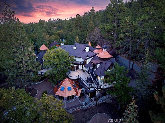 Tucked away in Big Bear’s coveted Village area, this unexpected Tudor-style estate is like no other — a private compound offering unmatched craftsmanship, serenity, and grandeur on nearly two acres of park-like grounds. Behind its gates lies your own private forest of towering pines and manicured pathways leading to charming gazebos, arched bridges, barbecue pavilions, and a turf sports court framed by the two-bedroom guest house. The main residence spans over 10,000 square feet across three levels, designed for both entertaining and peaceful retreat. On the lower level, an indoor rock grotto spa with its own bar sets a resort-like tone, complemented by a gym, sauna, and wine cellar. The main floor invites gatherings with a game room and full bar opening to a wraparound balcony and extensive outdoor patio. There is a spacious family room with a double-sided stone fireplace, a formal dining room, and a grand kitchen built for culinary inspiration. Also on this level are a private mother-in-law suite, an additional guest suite, 2 guest bathrooms, laundry room and walk in butlers pantry. The focal point of the entry, a sweeping circular staircase, leads to the upper level where the primary suite and retreat anchor the floor, along with two additional bedrooms and a stunning family room crowned by vaulted wood-beam ceilings. You will also find a richly detailed den with handcrafted beamwork surrounding the fireplace — currently used as a bedroom, though perfectly suited for a library or private study. The guest house, equally inviting, offers two bedrooms and its own living spaces ideal for extended family, staff, or short-term rental use.