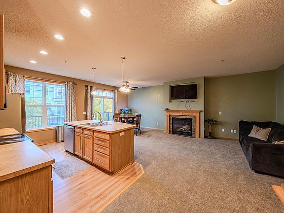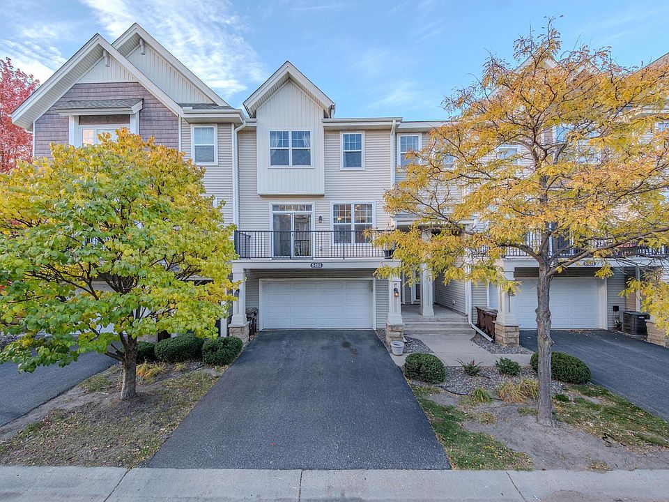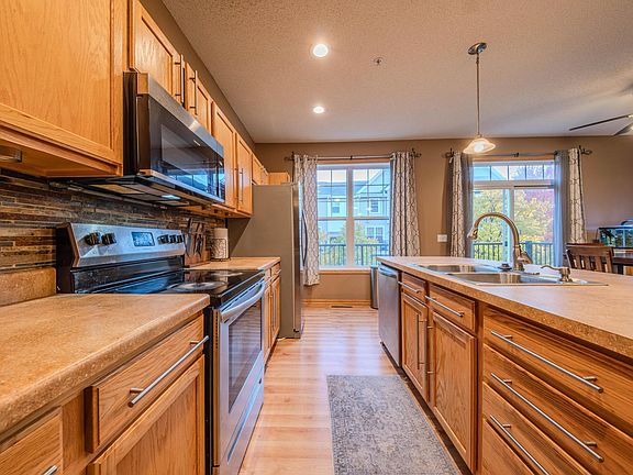 This south-facing townhouse in the highly desirable Emery Village community is move-in ready, boasting an abundance of natural light and an open floor plan. The center island kitchen features a stylish backsplash, stainless steel appliances, and cabinet hardware. The gas fireplace provides warmth throughout the seasons. Upstairs, two spacious bedrooms, including a large owner's suite with a walk-in closet and private attached full bath, await your personal touch. Fresh new carpet has been installed throughout the home. Conveniently located just off Hwy 169, Emery Village offers easy access to amenities like Target, Cub Foods, Lifetime Fitness, and many more. This beautiful home is ready for immediate occupancy.