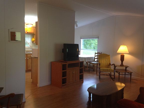 Located just minutes from town, this beautiful home sits on six, well maintained, acres. The home features two bedrooms and one bathroom. The living room is connected to the kitchen and the vaulted ceilings really opens the space up. The home includes a washer and dryer. The front deck over looks mature trees and leads to the carport