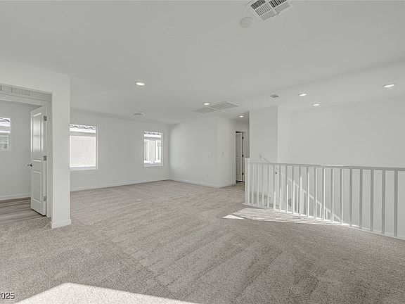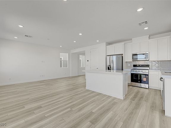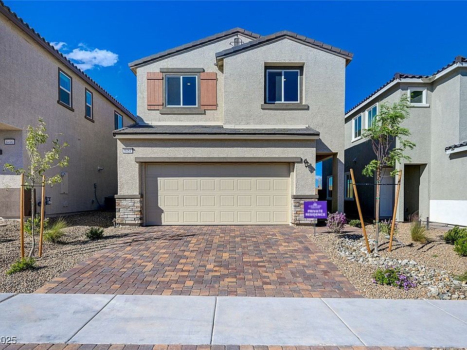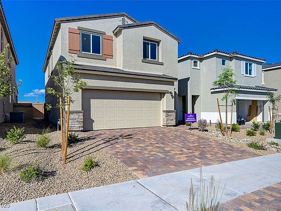 Be the first to live in this brand-new, stylish two-story home located in the highly desirable southwest Las Vegas area. The main level offers a spacious great room, dining nook, and a sleek modern kitchen featuring a large island, walk-in pantry, and a convenient downstairs bedroom. Upstairs, you'll find three additional bedrooms, a versatile loft, and a laundry room. The primary suite includes a generous walk-in closet and a spa-like bathroom with dual vanities and a walk-in shower. Highlights include an Alumawood patio cover, 8-foot sliding glass door, white cabinetry, quartz countertops, designer kitchen backsplash, and upgraded flooring throughout the main living areas.