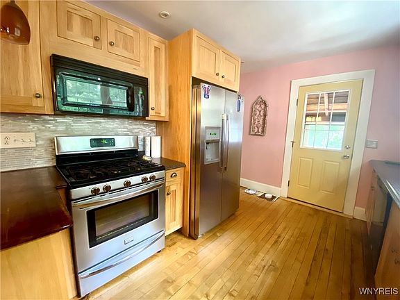 This 4 bedroom 3 bath energy efficient home has had lots of updates and has been well maintained. Fully applianced kitchen has Amish cabinets and lots of counter space. Open concept design to dining room and living room. Lots of natural light. Hardwood floors in living room. 1st Floor primary bedroom with beautiful tiled bath. Convenient 1st floor laundry. 2nd Floor has been completely updated and features 3 additional bedrooms and a full bath. Insulated walk up attic with lots of storage space. Back mudroom leads to a spacious fully fenced private yard. Shed offers outdoor storage. Relax on the side porch or watch the parade on the front porch. Minutes from NYS Thruway and the Village of Hamburg. Eden Schools. Welcome Home!