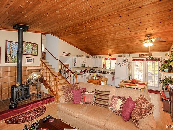 Wood-burning stovePrivate wooded settingSplit-level layoutTwo decksVaulted wood ceilingsLaminate flooring