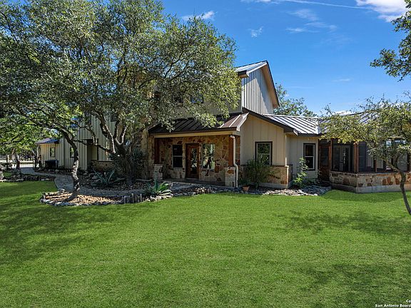 Welcome home to this stunning +/- 10-acre Texas-style estate located in the heart of the Texas Hill Country! This custom home exudes sophistication and craftsmanship, with a blend of natural elements and enduring design. Inside, you'll find beautiful natural wood flooring, ample natural light from large windows, and meticulous attention to detail, from hand-crafted cabinetry to a stunning stone fireplace. The home offers three secondary bedrooms and a dynamic game room for entertainment. The primary suite is luxurious, with private access to an enclosed patio and a spa-like en suite bathroom. Outdoors, you'll find a 3-stall barn with a tack room and corral for equestrian enthusiasts along with RV-covered parking. Host gatherings in style with an outdoor kitchen equipped with granite countertops, a sink, smoker, grill, and side burners. This property offers the perfect outdoor retreat with a pool, jacuzzi, and a cozy fire pit, making it an ideal place for relaxation and entertainment. Additionally, this property benefits from reduced tax obligations thanks to the wildlife exemption in place.