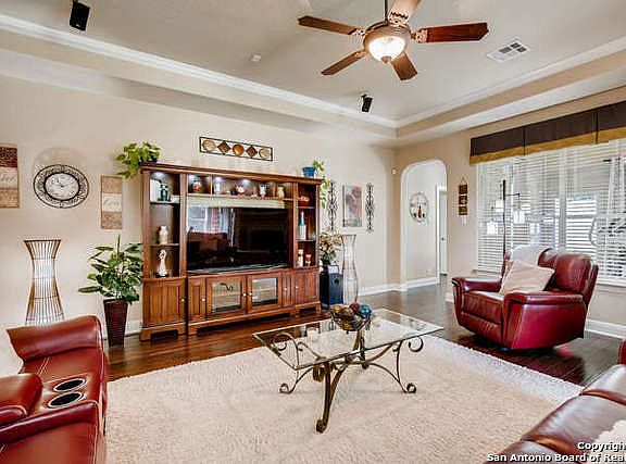 Fantastic 3/2.5/3 one-story 3,208sf beauty with stunning hill-country view. Open floor plan is great for entertaining and fine family living. Gourmet kitchen has granite counters and stainless appliances. Media room, complete with video, sound equipment and furniture convey. All rooms have hardwood/tile floors except for family room with carpet. Master bedroom is split from other bedrooms. Huge 3-car carage with 775 sf of floors space is coated with slip-resistant epoxy which is resistant to most stains.
