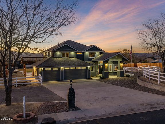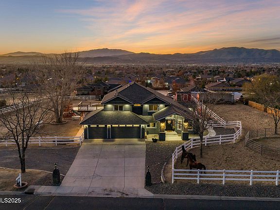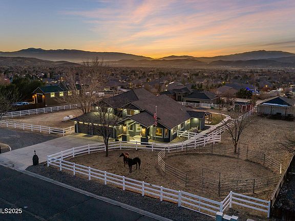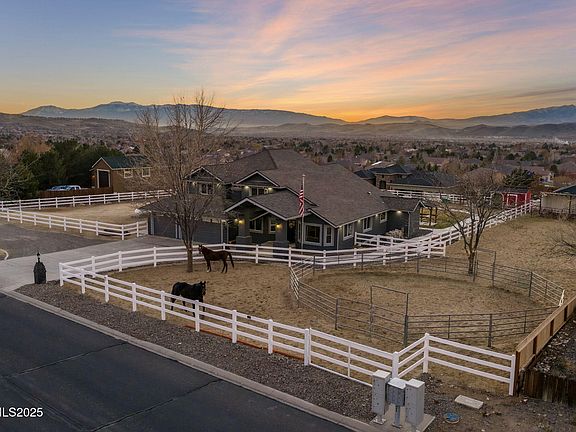 Welcome to 8495 Eaglenest Rd. in the desirable Wingfield Springs community, where opportunities to own acreage with the ability to keep horses are truly rare. Situated on 1.17 acres, this 3,318 sq. ft. home offers 5 bedrooms, 3.5 bathrooms, and the space and setting that make Northern Nevada living so special. The home has been updated throughout, with the kitchen as the clear centerpiece, complemented by luxury vinyl plank flooring throughout. Fully remodeled from head to toe, the kitchen was designed with both beauty and function in mind—featuring quartzite countertops and a huge matching quartzite island that anchors the space. A walk-in pantry with butcher block counters, open shelving, and custom cabinetry adds everyday practicality without sacrificing style. The kitchen flows naturally into the main living areas, creating an easy, connected feel for daily living and entertaining. West-facing windows capture expansive mountain views and bring in beautiful natural light throughout the day—then, as evening sets in, the sunsets unfold across the sky like a painting. The outdoor space is fully enclosed with white vinyl fencing and designed to be enjoyed, with room to gather, unwind, and take in the setting. The property is already set up for equestrian use, including a horse turnout with three sheltered stalls, round pen space, a 8x10 cross-tie, and 168 tons of brand new arena-mixed sand, along with tack shed space and a covered hay storage area.
