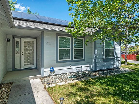 Picture yourself living in this beautifully remodeled Silver Shores Neighborhood beauty. Move-In-Ready, corner lot home, in a family friendly neighborhood. Nicely updated and naturally lit open kitchen with soft close cabinets and drawers.High ceilings and an open floor plan provide a spacious and comfortable feel. This 3 bed 2 bath, 3 car garage boasts mature landscaping and a backyard with electricity and a concrete patio where you can add a Hot Tub and enjoy seasonal views of the Peavine Mountains., Enjoy the new ceramic tile shower in the master bath! Also new within the last 2 to 3 years: Solar, Engineered Hardwood Floors & Carpeting, Windows, Interior Paint, HVAC, Refrigerator, Washer & Dryer. The 3 car garage is heated and has cabinet storage as well as enclosed storage in the space above the garage.Additional the side yard has a “She Shed” with electric. The kitchen, dining and living areas feature vaulted ceilings. Do not miss out on this opportunity! The newer solar system will be included!! HUGE BONUS!!!!