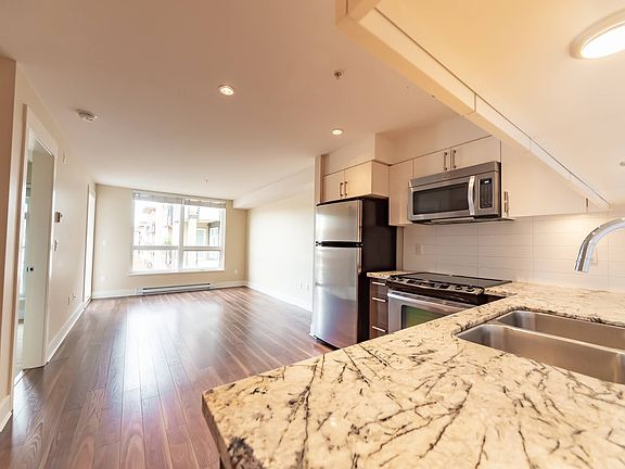 Granite countertopsStainless steel appliancesIn-suite laundryBright open-concept livingQuality laminate floorsBedroom with soft carpetNorth-east exposure