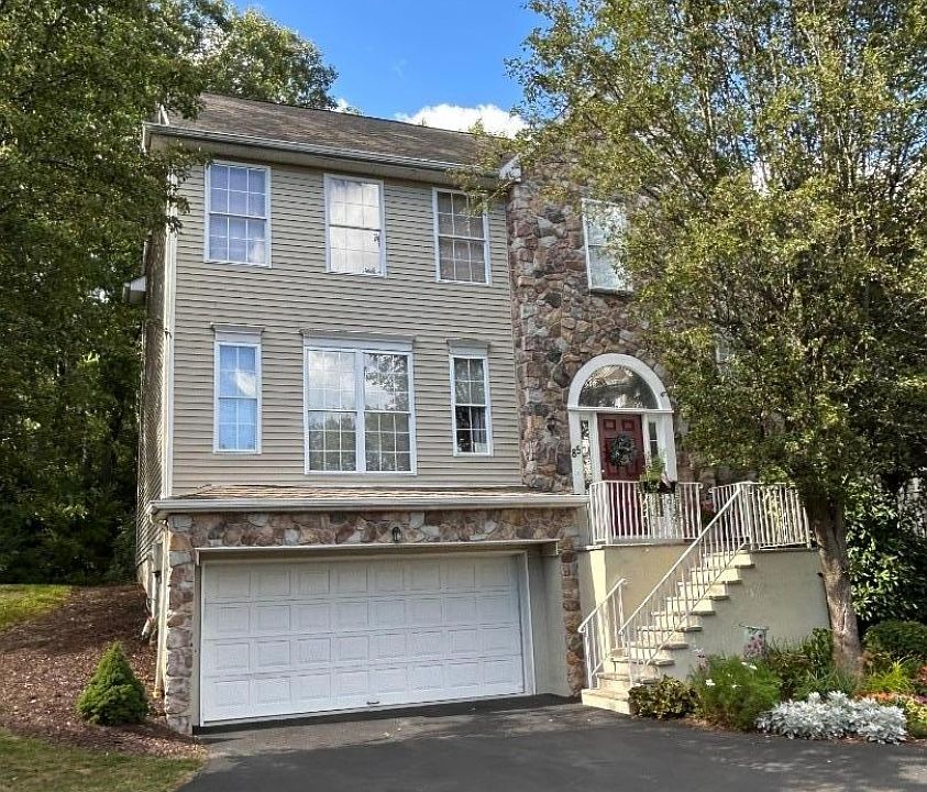 Gorgeous FREESTANDING open floor plan home. Private setting backing to woods. Deck on rear is not visible from other decks. Quartz eat in kitchen with pantry opens to family room w gas fp, large living room opens formal DR on the ell. Huge primary with large walk in closet. Att. bath a soaking t, two sinks and a shower. 2 additional bedrooms with hall bath. Finished basement with 2 car garage, laundry room and extra finished room for potential office, Rec room or storage. Hardwood floors on main level. Primo location near shopping and great Randolph schools.Complex has tennis courts, pool and playground area.
