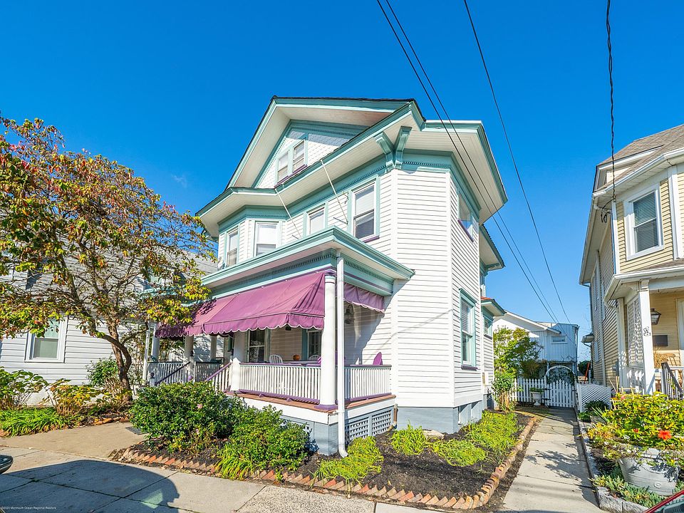 Visit this gorgeous 3 story, 7 bedroom, 2.5 bathroom 1890's victorian home and experience the relaxing lifestyle of the Jersey shore. Just a block away from the footbridge that carries you over Wesley Lake and directly into Asbury Park. Five short blocks to the beach. Enjoy lazy summer afternoons congregating on the long lemonade porch with custom awnings. Find delightful, pastel colored stained glass windows, historical woodwork, decorative shingled roof, dental moulding, fireplace and original period details inside and outside this home. As you exit the foyer and enter through the double French doors, you'll find a large living / dining area, streaming with light; a wonderful space for hosting and entertaining. The large kitchen offers lots of cabinetry, a pantry nook, ceramic tile