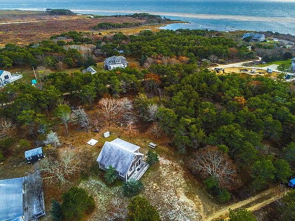 CHAPPY CAMP - CLASSIC COTTAGE WITH STUNNING WATER VIEW - Discover the allure and charm of Chappaquiddick with this idyllic cottage, evoking a simpler time when life on the island was filled with laid-back days. Nestled in a serene Wasque location, this property boasts breathtaking views of Dow's Pond, Katama Bay, and the Atlantic Ocean. Throw open the windows to the salt air and the soothing sounds of the south shore waves. The first floor features a bedroom. A welcoming kitchen/dining/living area that opens to a front deck, ideal for savoring morning coffee and witnessing spectacular sunsets. Ascend the spiral staircase to the second floor, where two bedrooms offer panoramic views over Katama Bay and the Atlantic Ocean. A short stroll leads to the calm waters of Katama Bay, perfect for shell fishing, swimming, and boating, with easy access to Norton Point and just steps away from 200 acres of the Trustees of the Reservations Wasque conservation. An opportunity to expand the property is rare this close to the water. Offered "as is," this cottage presents a unique opportunity to escape the demands of a busy world and embrace the tranquility and beauty that Chappy has to offer. Don't miss out on this exceptional property in an unbeatable location!