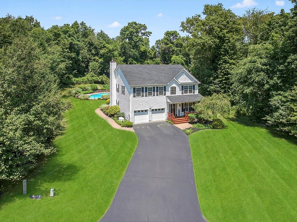Sweet Summer Nights Spent on this Cozy Rocking Chair Porch! Discover this meticulously maintained 2,500 sq ft home, nestled in a quiet neighborhood. This spacious residence offers three bedrooms plus a versatile flex room or den—perfect for a home office, playroom, or guest space. Soaring vaulted ceilings and gleaming hardwood floors enhance the airy, open feel, while elegant architectural pillars add definition and charm to the living room. The home also features a full, unfinished basement offering endless potential for future expansion or storage. Some additional features include central air with new air handler (2yrs), all three of the bedrooms boast brand new carpet, and there is a new roof (2yr) that adds peace of mind. Step outside to a beautifully landscaped backyard oasis, where a freeform inground pool is surrounded by lush greenery—an ideal setting for summer entertaining or quiet relaxation. A true gem inside and out, this home offers both comfort and curb appeal in a prime, commuter-friendly location, close to Routes 17K, 52, and 84. Valley Central School District.
