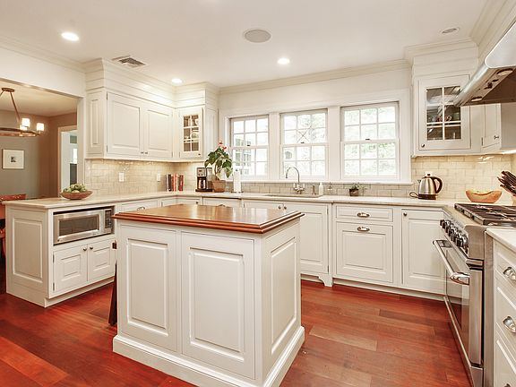 Fabulous, sun-filled Colonial expanded and renovated in 2003. First floor replete with entry hall, formal living room with fireplace & French doors to front patio, dining area open to custom kitchen with island, stainless appliances, pantry with wine refrigerator & desk, large family room with doors to rear yard, den/bedroom with built-ins, bedroom with doors to patio, full bathroom and sun room/office. Second floor features large sitting area, master bedroom, master bathroom with soaking tub, two family bedrooms with ensuite baths and laundry room. Home boasts hardwood floors, walk-in custom closets and outdoor heated shed. Situated on private and beautiful, professionally landscaped property with two patios, deck, stone walls, vegetable garden, circular drive in walking distance to town.